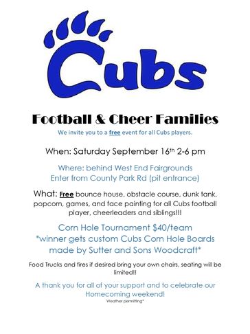 What: Free bounce house, obstacle course, dunk tank, popcorn, games, and face painting for all Cubs football player, cheerleaders and siblings!!!